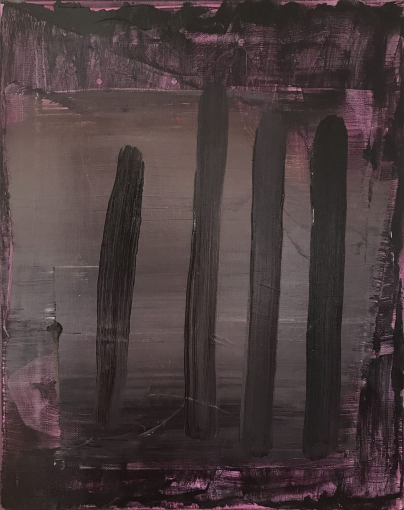 De abstrakta dukarna fokuserar på det komplexa samspelet mellan material, ljus och form. Målningarna förkroppsligar en form av komprimerad eller upplöst tid och rum.